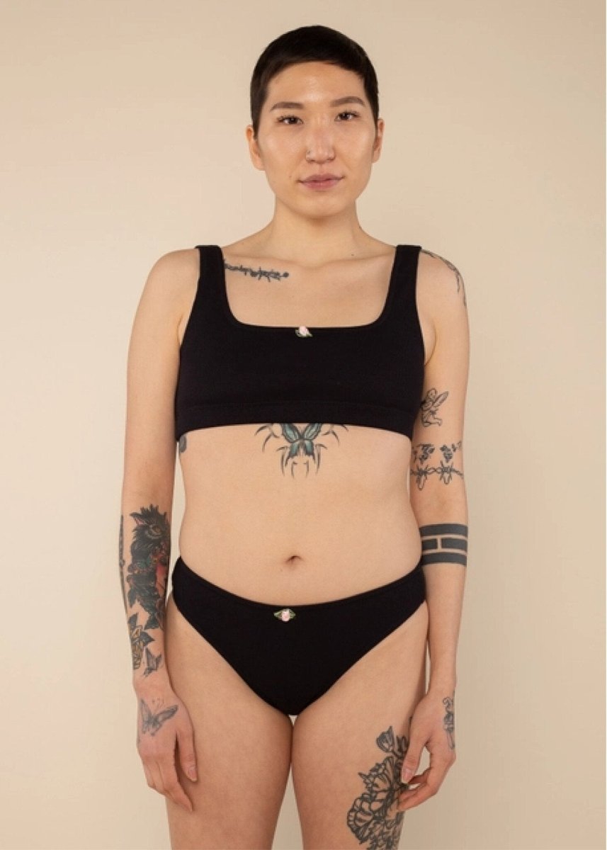 Cotton rib square neck double layer bralette with 1" elastic band and satin rose trim.