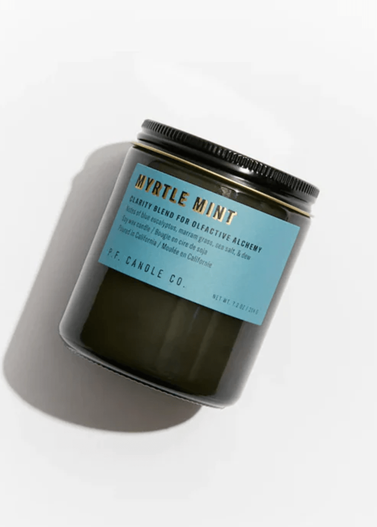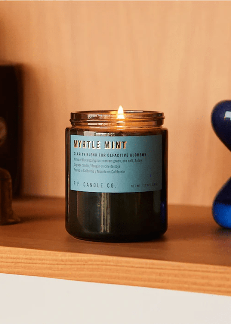 Alchemy Candles feature smoke-colored glass vessels, black metal lids, and gold-leafed labels inspired by vintage window lettering.