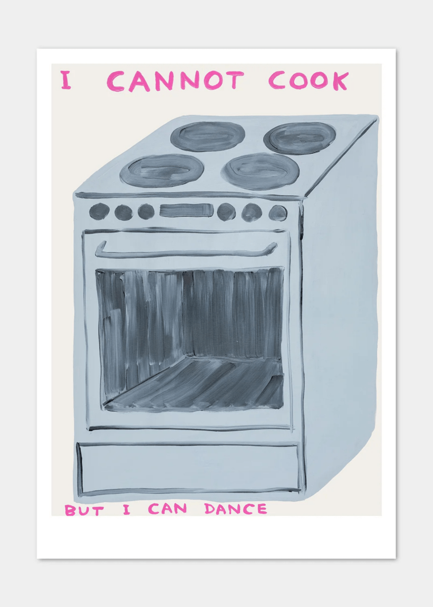Cette affichette est issue de l’œuvre originale de David Shrigley : I Cannot Cook (2020). Les images colorées de l’artiste sont imprimées sur des cartes postales A5, accompagnées d’un dessin original réalisé à la main au verso. Ces cartes sont conçues pour partager bonne humeur, rire et amour.