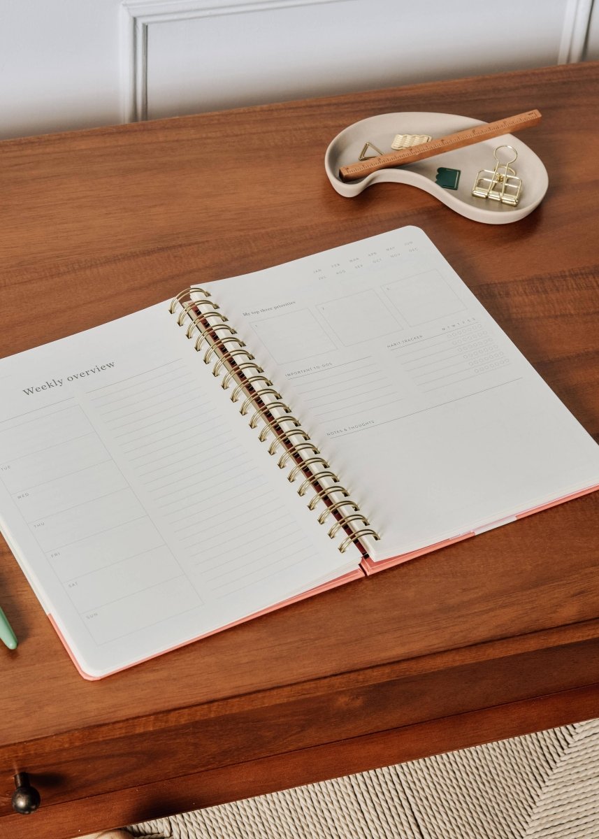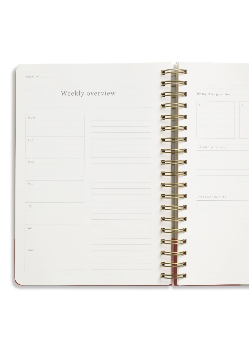 Organisez-vous et trouvez un bon équilibre entre vie professionnelle et vie privée grâce au planificateur de productivité en spirale de Papier, d'une durée de 16 semaines. À l'intérieur, il y a de l'espace pour planifier vos journées et vos semaines, écrire vos tâches, fixer et revoir vos objectifs, suivre vos habitudes et réfléchir à votre développement personnel. Posez les pages à plat et planifiez avec une structure non datée que vous pouvez remplir à tout moment de l'année.