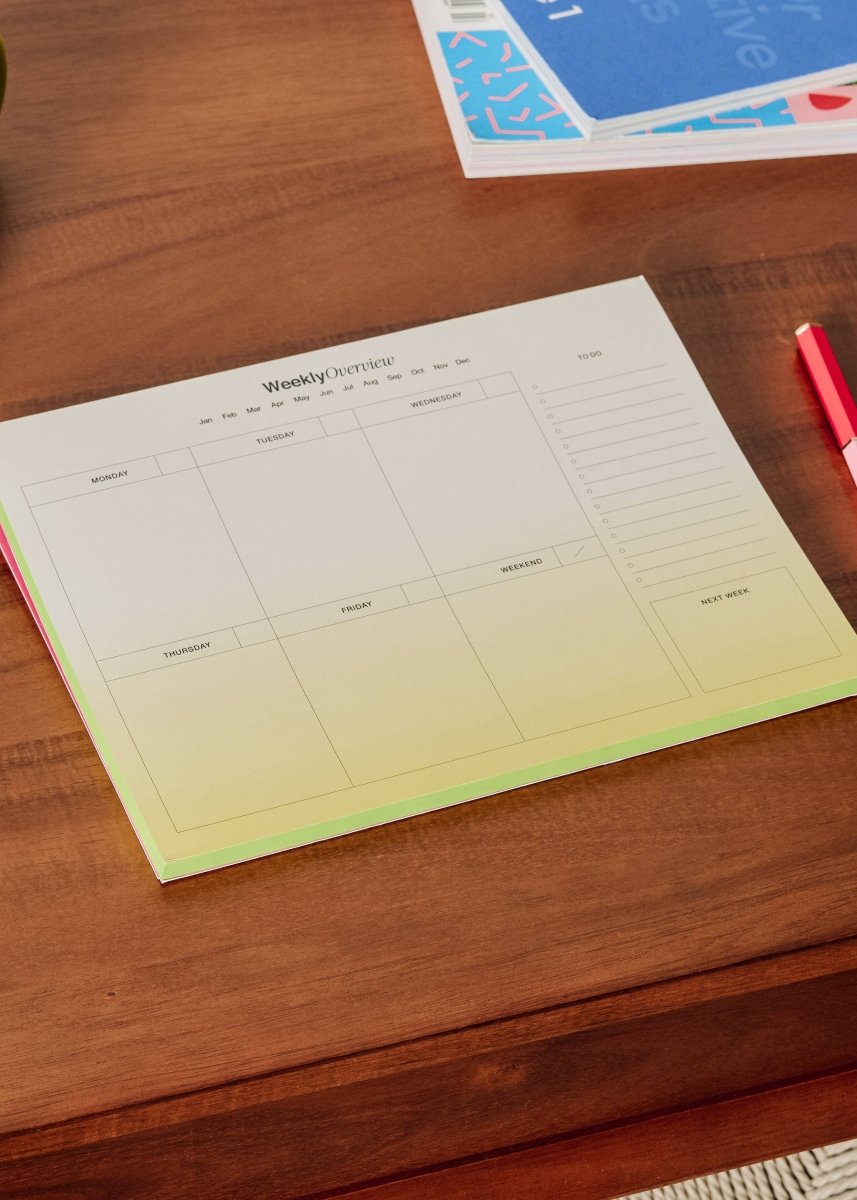 Pour ceux qui aiment planifier, les agendas Papier sont les nouveaux compagnons quotidiens à avoir à vos côtés. Structurez votre semaine avec des tâches à accomplir, des objectifs, des idées de dîner, des plans d'exercice, des rappels et bien plus encore. Ils ne sont pas datés et sont dotés de pages faciles à détacher.