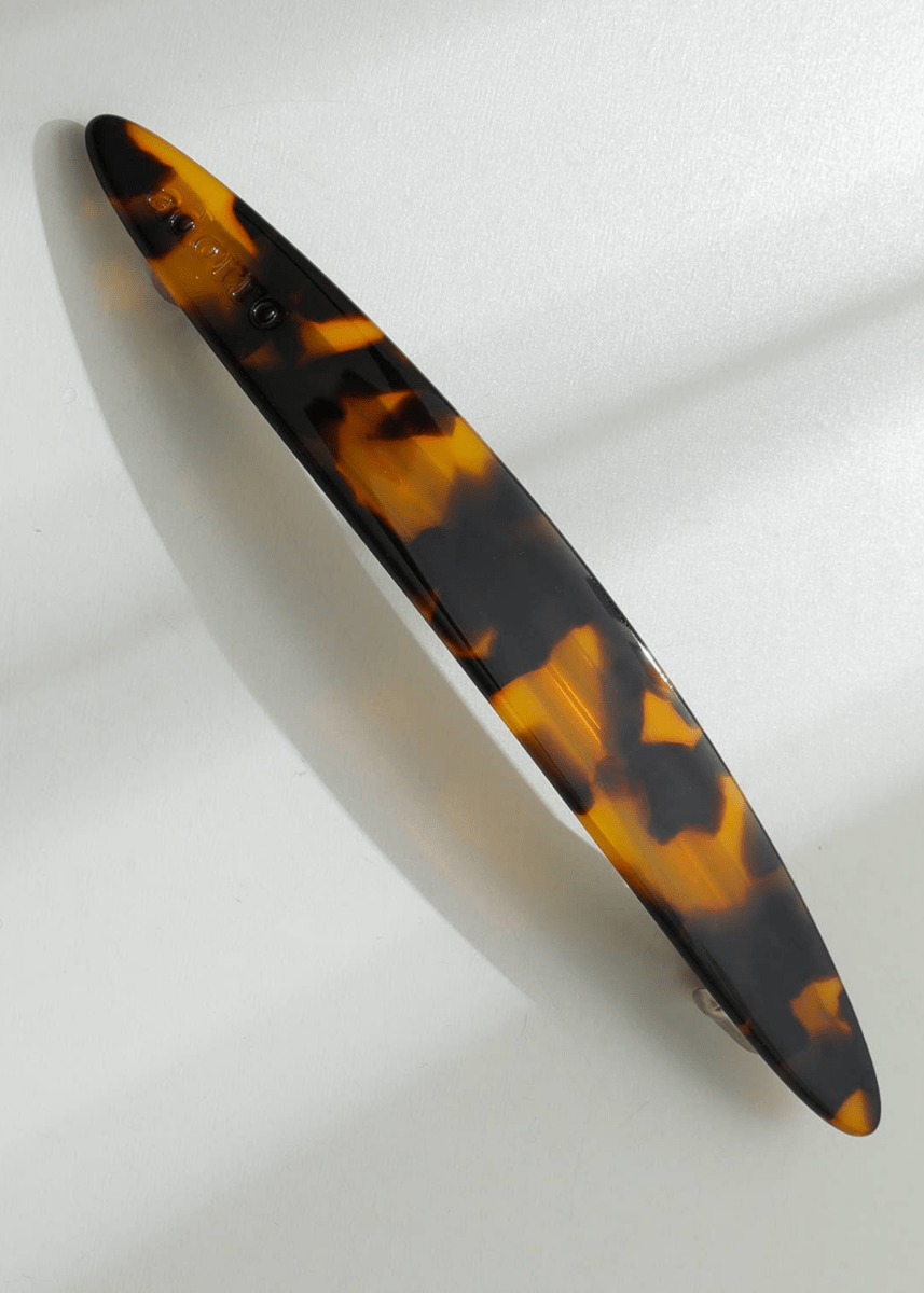 Avec sa forme oblongue et pointue, cette pince en acétate de 4.5 pouces tiendra les cheveux moyens/longs et est idéale pour les demi-queues.