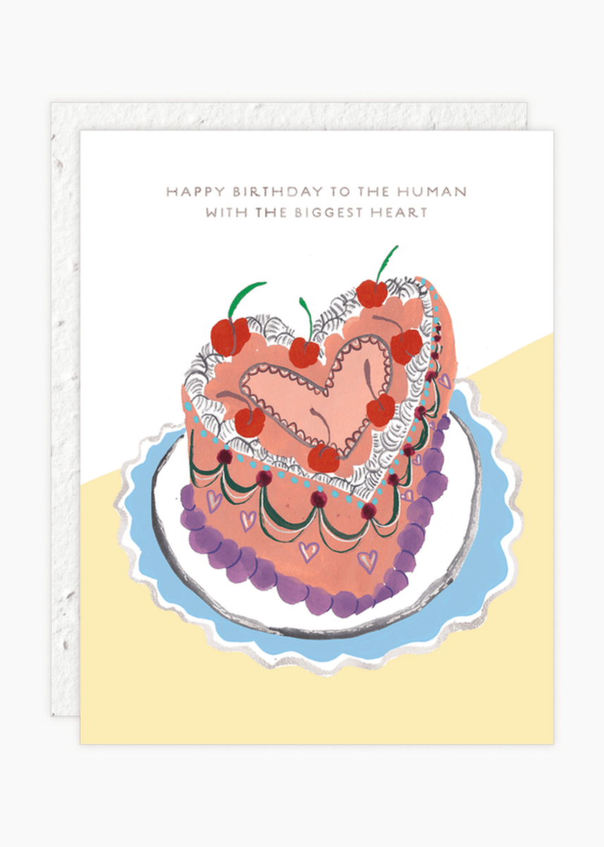 Cette carte mesure environ 4,25" x 5,5" et est accompagnée d’une enveloppe de 4,3125" x 5,75", au format A2, idéale pour toutes les occasions spéciales. Fabriquées avec soin aux États-Unis, les cartes Seedlings comme Heart Shaped Cake combinent respect de la planète, qualité et design charmant.