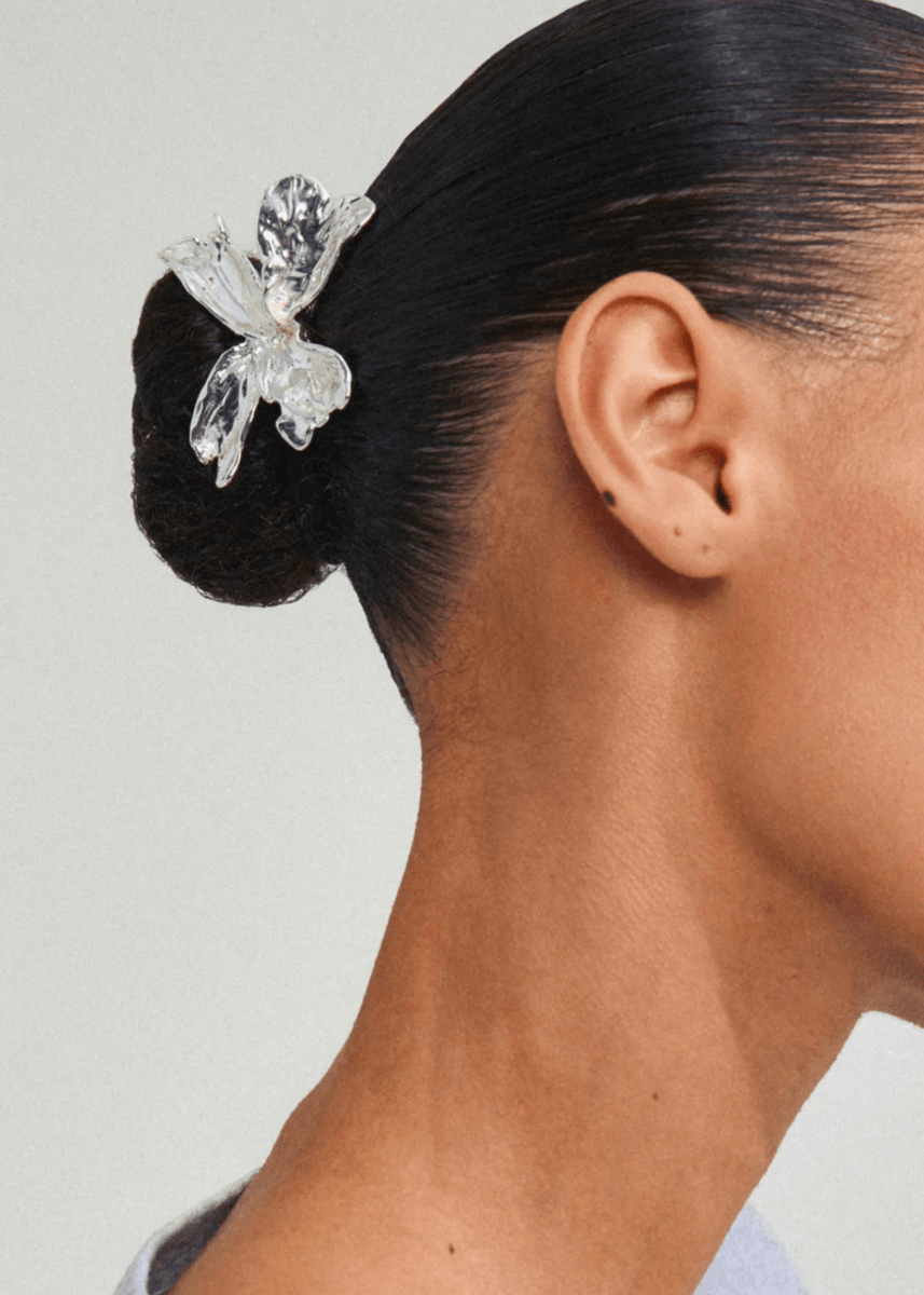 Ce petit bijou est orné d’un grand pendentif en forme de fleur, disponible en plaqué or ou argent, qui apporte une touche originale et délicate à tes coiffures. Que tu l’utilises pour attacher une queue de cheval, un chignon ou simplement comme un accessoire décoratif, il se transforme aussi en un élégant nœud qui donne du caractère à tes looks d’été. Sa finition brillante illumine ton style tout en restant discrète et raffinée. De plus, cet élastique n’est pas seulement joli : il est fabriqué à 95 % à partir de matériaux recyclés, ce qui montre tout le soin apporté à sa conception pour respecter notre planète.
