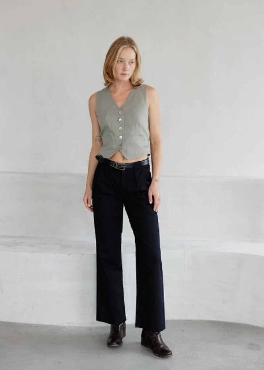 La ceinture réglable à l'arrière ajoute une touche personnalisée, tandis que la fabrication en lin assure le confort.