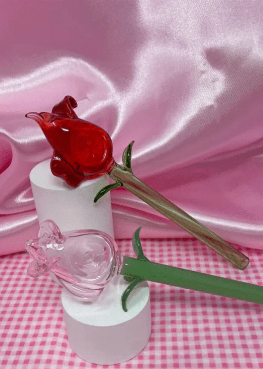 Le carburateur est situé sur le côté gauche du bol. Fabriqué en verre borosilicate. Mesure 7" x 1,5" x 1". Le bol est flanqué de pétales et d'une jolie tige avec de petites feuilles.