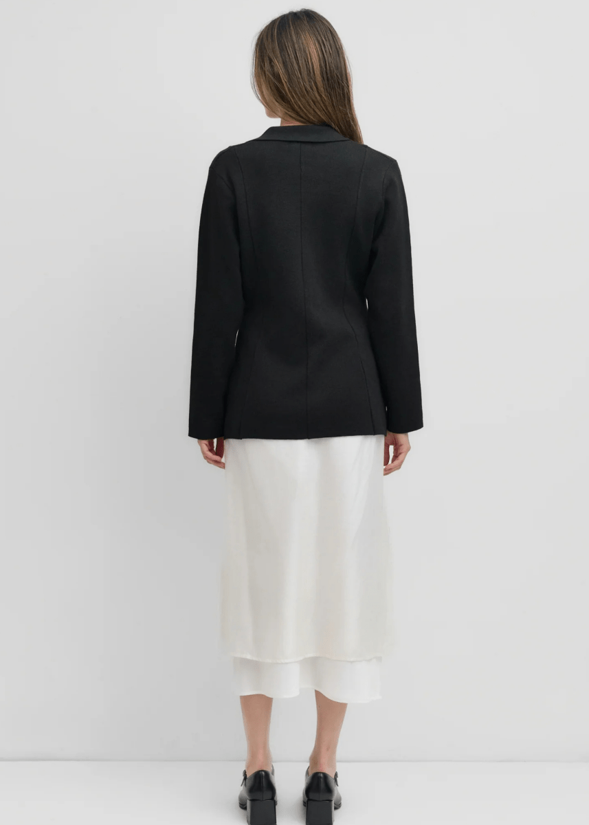 La veste Nicola est un blazer moelleux et long avec des côtes Milano denses et une taille bien marquée, pour une silhouette structurée et flatteuse.